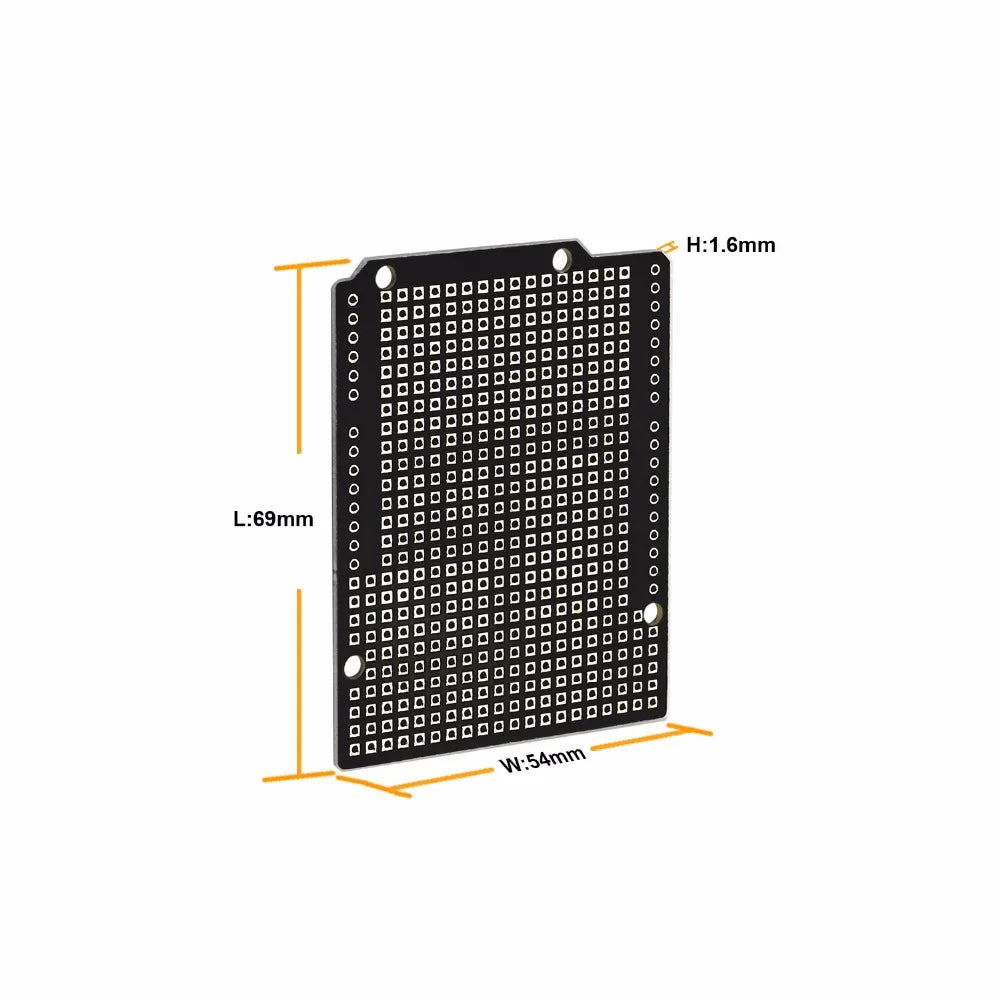 For easy use, other components can be directly soldered on the PCB through-holes to complete various prototype circuits. A tiny breadboard can be stuck on the prototyping area to complete various circuit experiments using jumper wires.