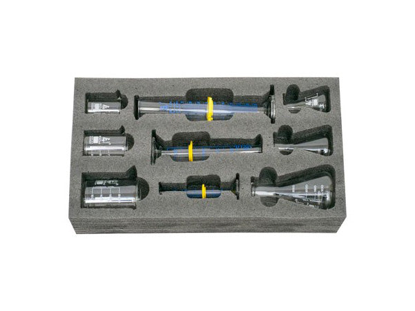 Beakers and flasks feature white, printed graduations, and beaded rims. Cylinders feature blue printed graduations, hexagonal bases and removable, plastic protective collars for added stability. Uniform, thick walls provide excellent strength against breakage. Set is packaged in a custom fit, thick foam casing, for safe storage and worry free transport. Designed for use in professional laboratories, but is ideal for classroom, garage and home education use.