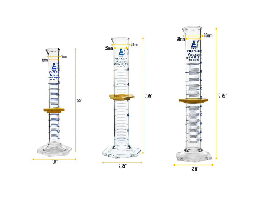 three ASTM, Class A Measuring Cylinders in 10ml, 50ml & 100ml capacities and