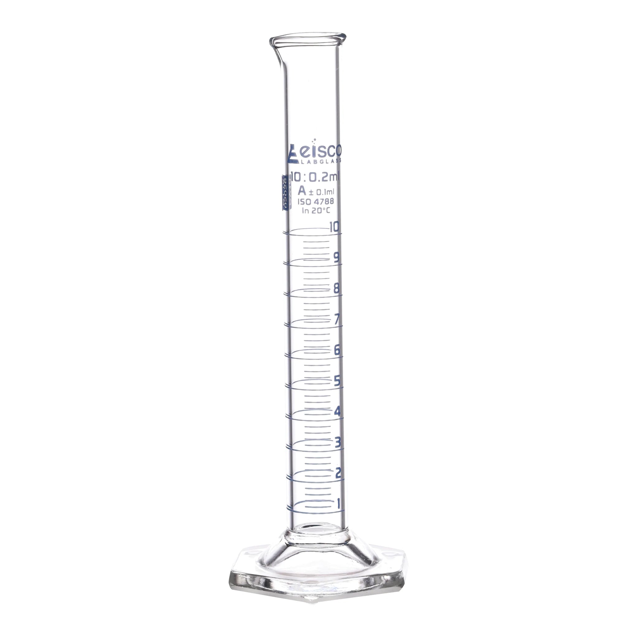 Pack of two10ml graduated measuring cylinder made of high quality, heavy duty Borosilicate 3.3 glass. Spout for easy pouring, and hexagonal base for extra stability. Class A tolerance, ±0.10ml as per DIN EN ISO 4788 standard.