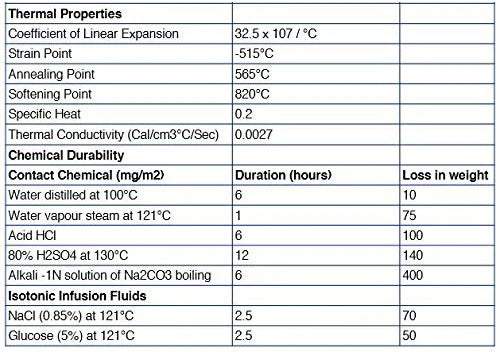 Autoclavable, with superior chemical durability. Low temperature gradient - can withstand high temperatures & thermal shocks. Borosilicate glass has the following heat tolerances: Strain Point -515°C; Annealing Point 565°C; Softening Point 820°C. Calibrated to contain.
